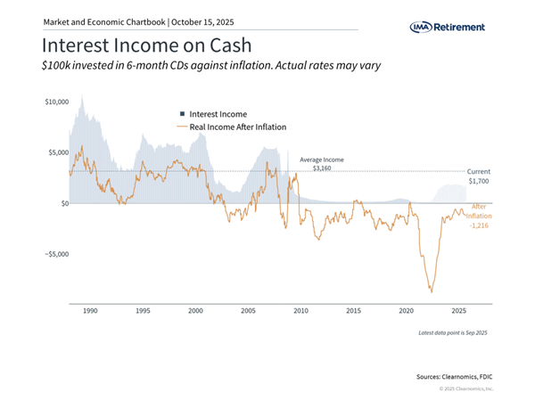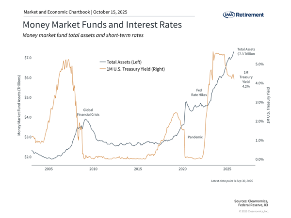 However, as rates have begun to moderate and are expected to decline further, these excess cash holdings could face reinvestment challenges. Investors who moved significant assets to cash when rates were temporarily high, or during periods of market stress, could face difficult decisions. This is often referred to as “cash on the sidelines,” and reflects the possibility that some investors may move back to stock and bond investments over time.