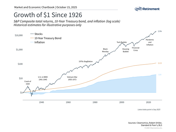 The history of financial markets is clear when it comes to growing the value of hard-earned savings and beating inflation. As shown in the chart above, stocks and bonds have risen magnitudes more than inflation. Even though what used to cost $1 in 1926 now costs $18 today, stocks and bonds have risen many multiples more, creating true wealth for those who were positioned for these long trends. This is true despite periodic market pullbacks, financial crises, and recessions over the past century.