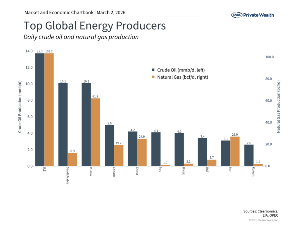However, some perspective is needed. Current oil prices remain well below the 2022 peak of nearly $128 per barrel when Russia invaded Ukraine. Today’s environment is quite different. In 2018, the U.S. also became the world’s largest producer of oil and natural gas, with current domestic production exceeding other major producers such as Saudi Arabia and Russia. While the U.S. still relies on global energy markets, this level of production helps to insulate the domestic economy from supply disruptions.
