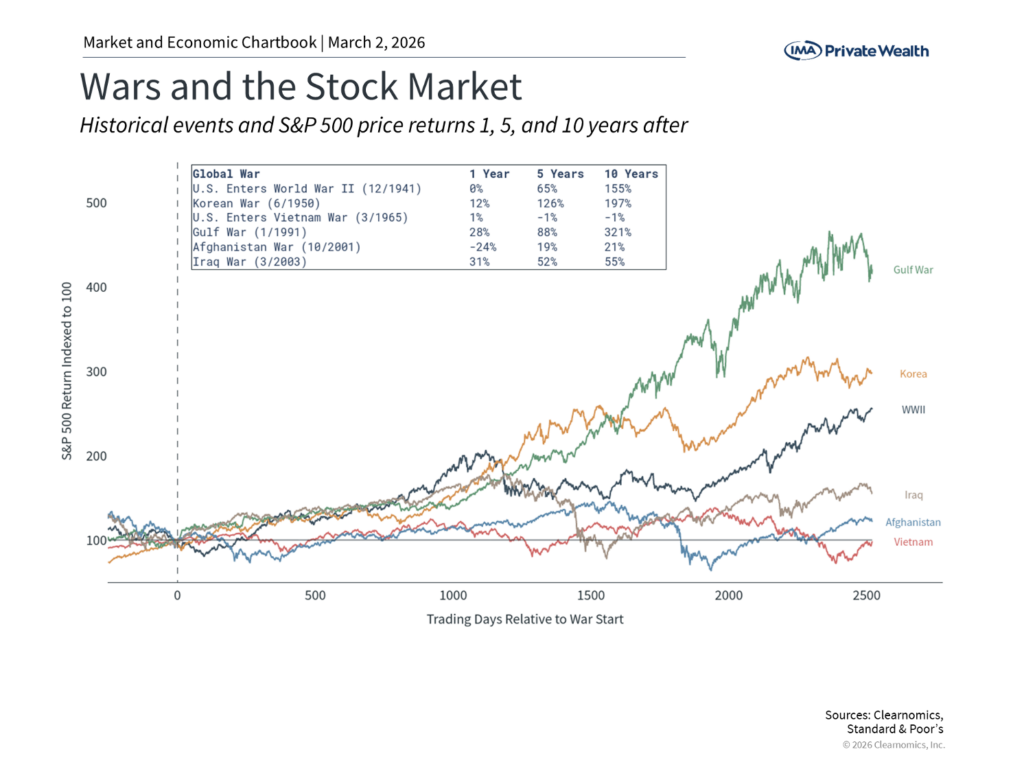 For long-term investors, the most important lesson from past geopolitical conflicts is the value of staying invested. It’s natural to feel uneasy when headlines describe military strikes, retaliatory attacks, and the possibility of a wider regional war. These events involve real human consequences and are unlike the typical flow of market news about earnings, valuations, and economic data.